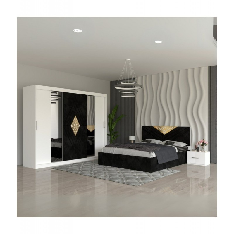 Transformă‑ţi dormitorul într‑un spaţiu memorabil cu Dormitor Imperial Negru – un set complet ce combină finisajul intens de negru cu un design modern şi funcţional. Patul, disponibil în dimensiunile standard (140×200 cm, 160×200 cm, 180×200 cm), se adaptează spaţiului şi stilului tău. Dulapul‑dressing, cu lăţime de 250 cm şi înălţime 200 cm oferă spaţiu amplu pentru haine, încălţăminte şi accesorii.